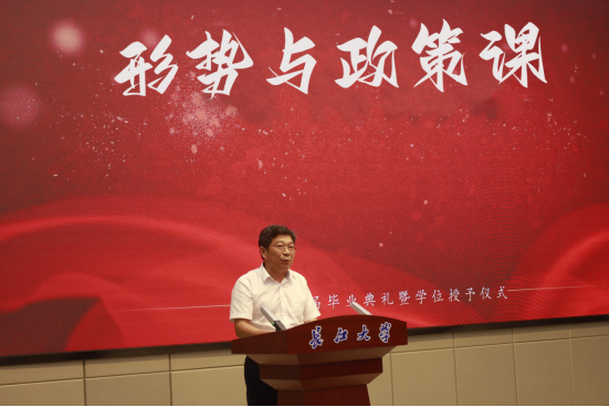 6月8日下午,在武汉校区学术报告厅,91网 院长江厚顺为2023届全体毕业生讲授形势与政策课。