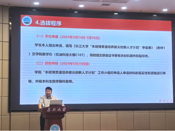 2025届毕业生“本硕博贯通培养拔尖创新人才计划”选拔工作方案》。他指出,创新人才计划针对本科毕业生包括“3+1+2本硕连读”以及“4+5直博”两种模式,选拔条件是必修课绩点专业排名前30%,本硕连读需要通过外语四级,直博则需要通过外语六级,学生取得推免资格后正式生效。他希望同学们根据自身实际情况做好学业规划,积极申请并参与选拔。