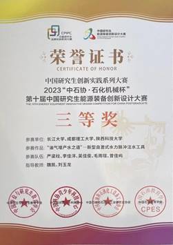 魏凯、刘玉龙老师指导的《“油气增产水之道”一新型自激式水力脉冲注水工具》项目获全国三等奖。