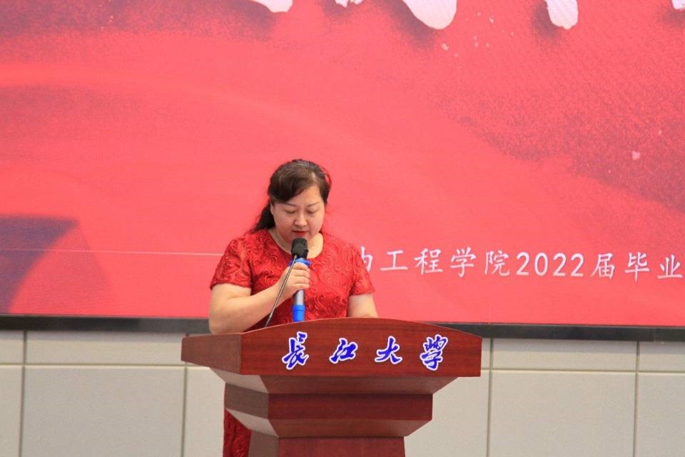 院长江厚顺教授、副院长李忠慧教授、张引弟教授、张菲菲教授,导师代表廖锐全教授、付美龙教授、熊青山教授等,教师代表、全体辅导员以及毕业生代表到场参会,学院党委副书记刘娥主持典礼。