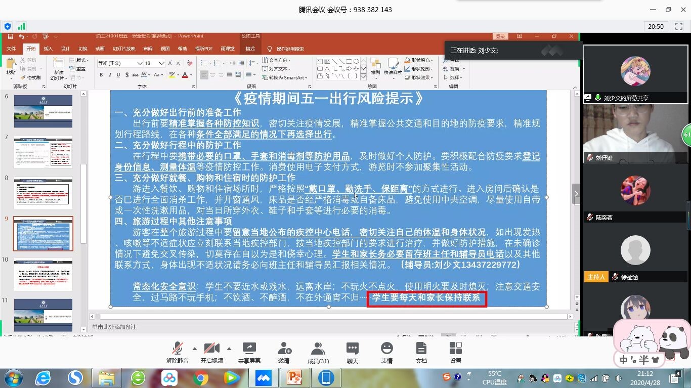 常抓不懈保障学生安全,持之以恒贯穿学生工作。疫情期间,五一假期临近,学院密集部署学生安全教育工作,学生安全教育班会、家长会、心理健康教育工作全面开展,学院安全教育工作在本科生研究生中全覆盖。