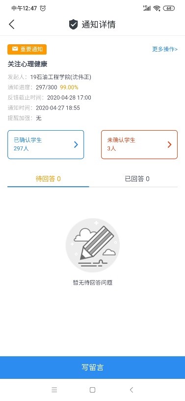 致家长的一封信》,再次提醒家长坚定服从政府在疫情期间的防疫政策,在未得官方通知前,学生不得返校,提醒家长在居家期间要培养良好亲子关系,关注学生身心健康,主动和学生谈心交心,科学理解学生心理情绪,并公开告知家长各年级辅导员联系方式一起学校心理健康教育中心求助方式。学院通过辅导猫以及班级QQ群等形式,对学生开展了心理健康教育工作,鼓励学生科学求助,助力学生在疫情期间化解压力。