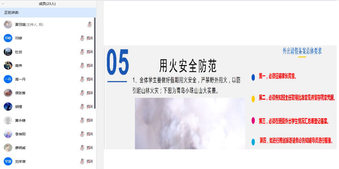 4月26日开始,各班召开“五一假期安全教育班会”,全体班主任、学生线上召开班会,对疫情发展、出行防护、安全返回以及吃住行、盗火水、坛心网、毒艾恐”12个方面进行了详细教育。学院向全体学生发布了《疫情期间五一出行风险提示》,对出行的前期准备、旅途防护、就餐购物和住宿安全等做了详细的提示。同时制定了辅导员-班主任-安全员三级安全体系,全面实时了解学生动向,对于出行的学生进行的填表登记,按照程序填报出行信息和安全健康信息,加强学生在五一以及居家时期的安全保障。