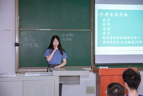 第一次班会的开始总是伴随着生涩,尽管同学们都有些害羞,但在班级导师热情的引导下,大家还是一个接着一个的在讲台上做起了自我介绍。在交流中,同学们讲起了各自的家乡,有的同学甚至讲起了方言,将氛围带动了起来同学之间也没有了刚来时候的尴尬,彼此之间有了初步的认识,班会也因为部分大胆风趣的同学逐渐变得活跃,传出一阵阵热烈的掌声。