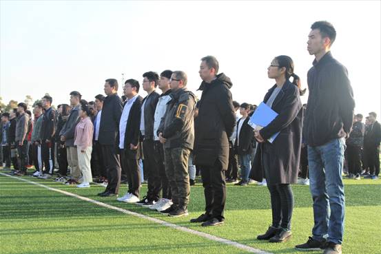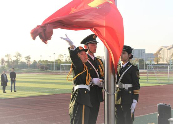 早七时,在油工院学生注视礼下,国旗护卫队出国旗。响亮的口号穿破广阔操场,他们踏着坚毅的步伐,沿着跑道护送国旗一路至国旗杆下。紧接着,升国旗,奏国歌,全体同学行注目礼。
