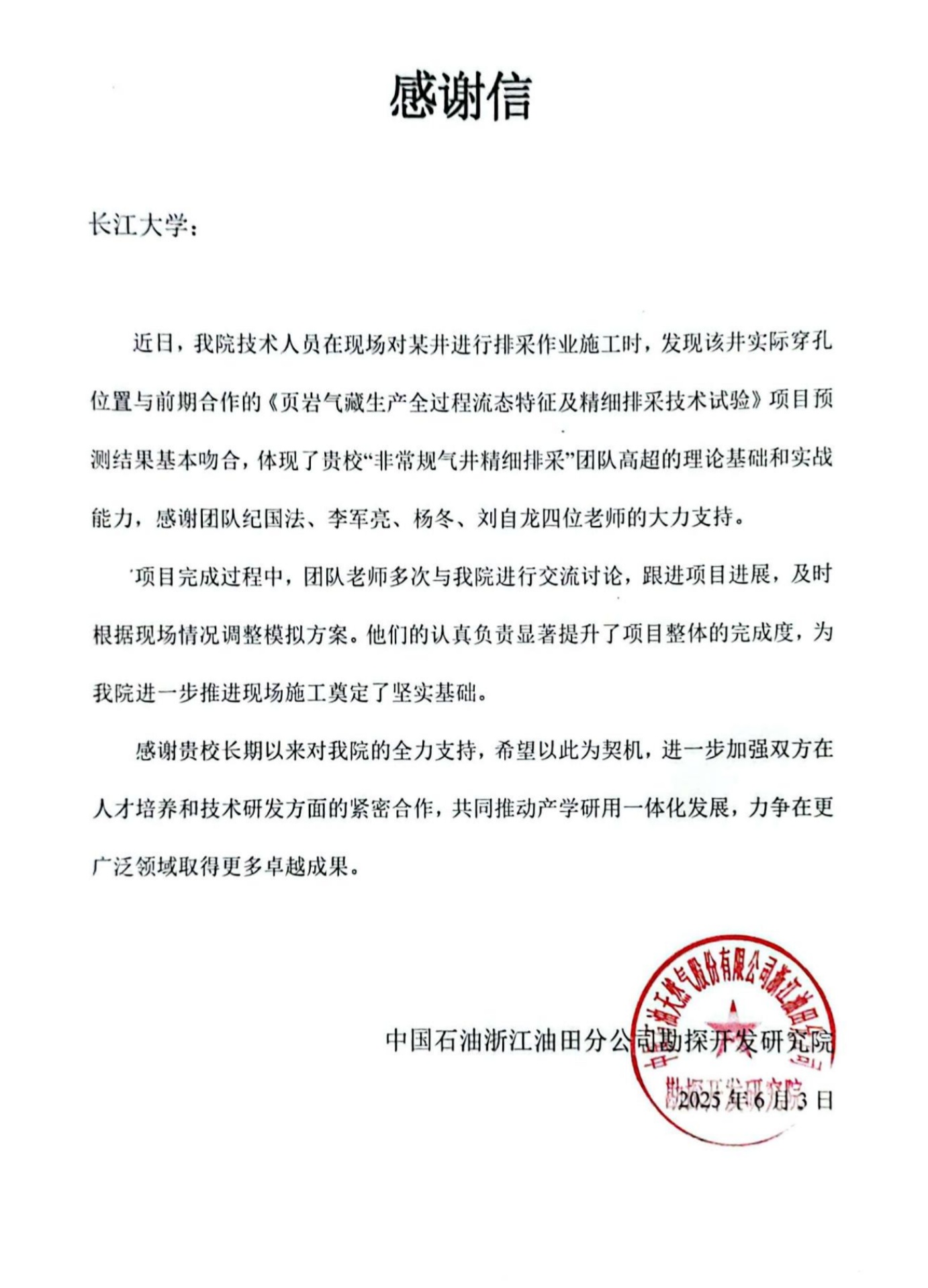 浙江油田勘探开发研究院在感谢信中表示,感谢91网