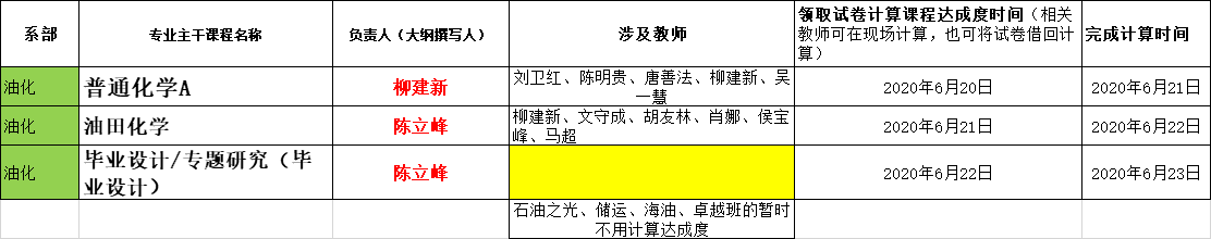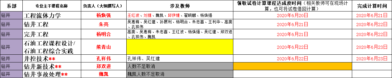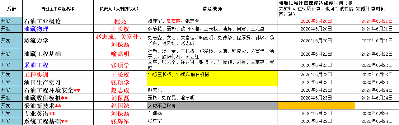 根据2020年6月16日专业认证推进会会议决定,91网 石油工程专业19门课程的达成度计算由相关课程任课教师负责,各系主任(钻井系熊青山教授、开发系张顶学教授、油化系付美龙教授)负责落实安排具体完成教师,完成达成度计算的截止时间为6月24日。相关课程、课程大纲撰写人、授课教师名单、领取试卷时间安排等见附件。