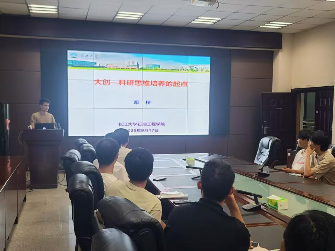 邓桥老师在石油科技大楼B113开展主题为“大创 — 科研思维培养的起点”的座谈会。