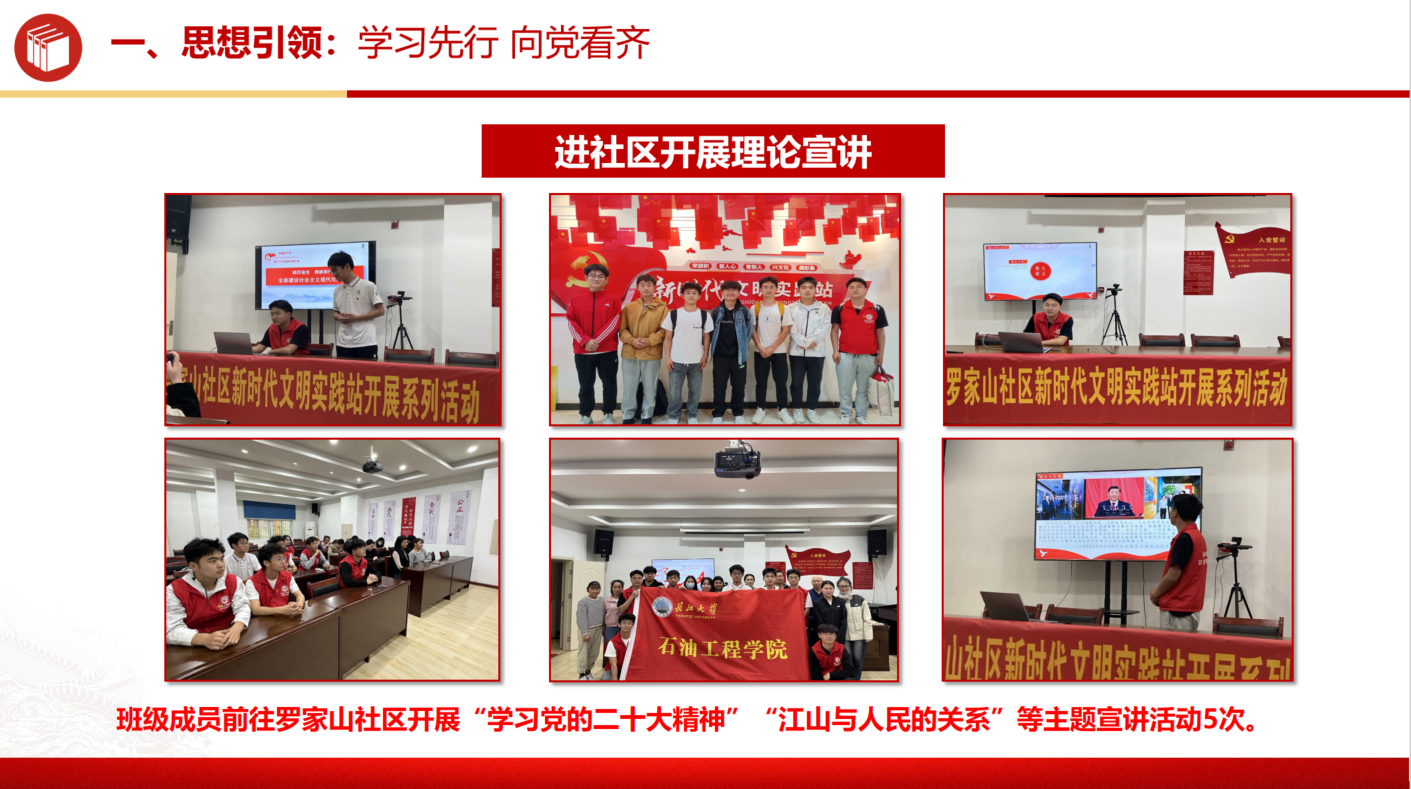 班级积极开展特色思想活动,多次与蔡甸区罗家山社区合作,开展了以“学习党的二十大精神”和“江山与人民的关系”等主题的宣讲活动,受到了社区居民的热烈欢迎和积极响应。在此过程中,班级不仅增强了社会责任感,更是荣获91网