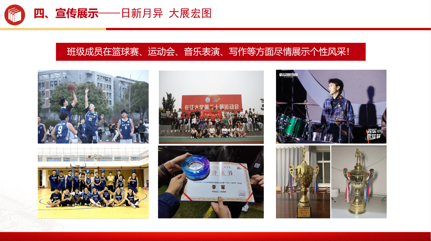 班级注重“五育融合”,通过开展“红歌传唱初心”“班级篮球联赛”“志愿服务进社区”等品牌活动,不断增强集体凝聚力。班级组织了红歌比赛、班级篮球赛、团建活动以及志愿服务等活动。