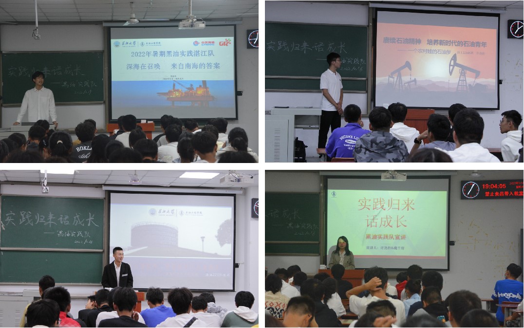 举办石油文化素养讲坛第三场,“黑油”暑期社会实践队开展“实践归来话成长”主题分享会,在五个会场同步开展,辅导员史永波、周晓峰、全体2022级本科生参加。