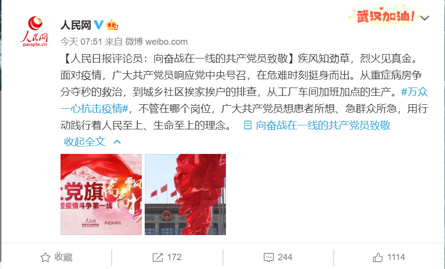 此次新型肺炎简称NPC,该新型冠状病毒被命名为2019-nCoV,它不叫“武汉肺炎”,更不是“中国肺炎”,某些图谋不轨的境外势力乘机大做文章,试图摸黑中国的国际形象,这不仅让人们清醒,更让我们更加团结一致,明辨是非,力争打赢这场“战役”,彰显中国力量。但是,人心难控,对武汉返乡人员的信息曝光、对武汉的歧视、对中国的排斥,让一场本为人类共同面对的灾难,瞬间转化为地域或民族的对立。我们庆幸清醒并且有勇气的大多数人站了出来,说出不一样的声音,道出胜利的关键,那就是在灾难面前,人类理应结成一个坚实且温暖的命运共同体。疫情就是战争,不幸的是这次战争的前线在中国,所幸的是战争的后方是全世界。